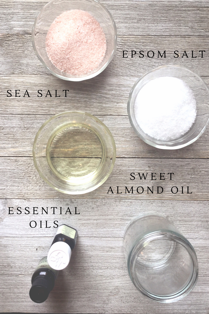 - Combine the sea salt (or epsom salt,) sweet almond oil and essential oils in a small glass jar. Stir to combine.