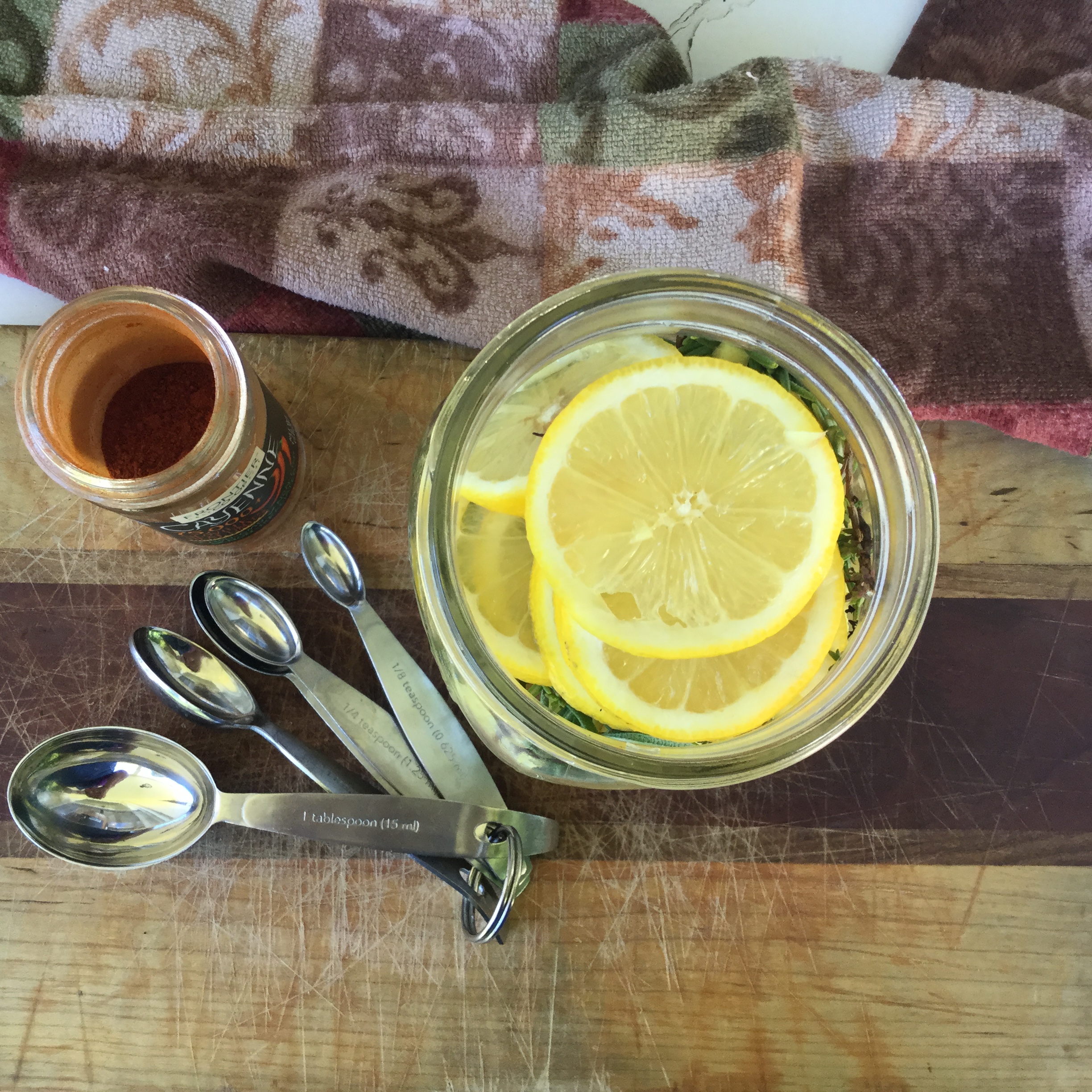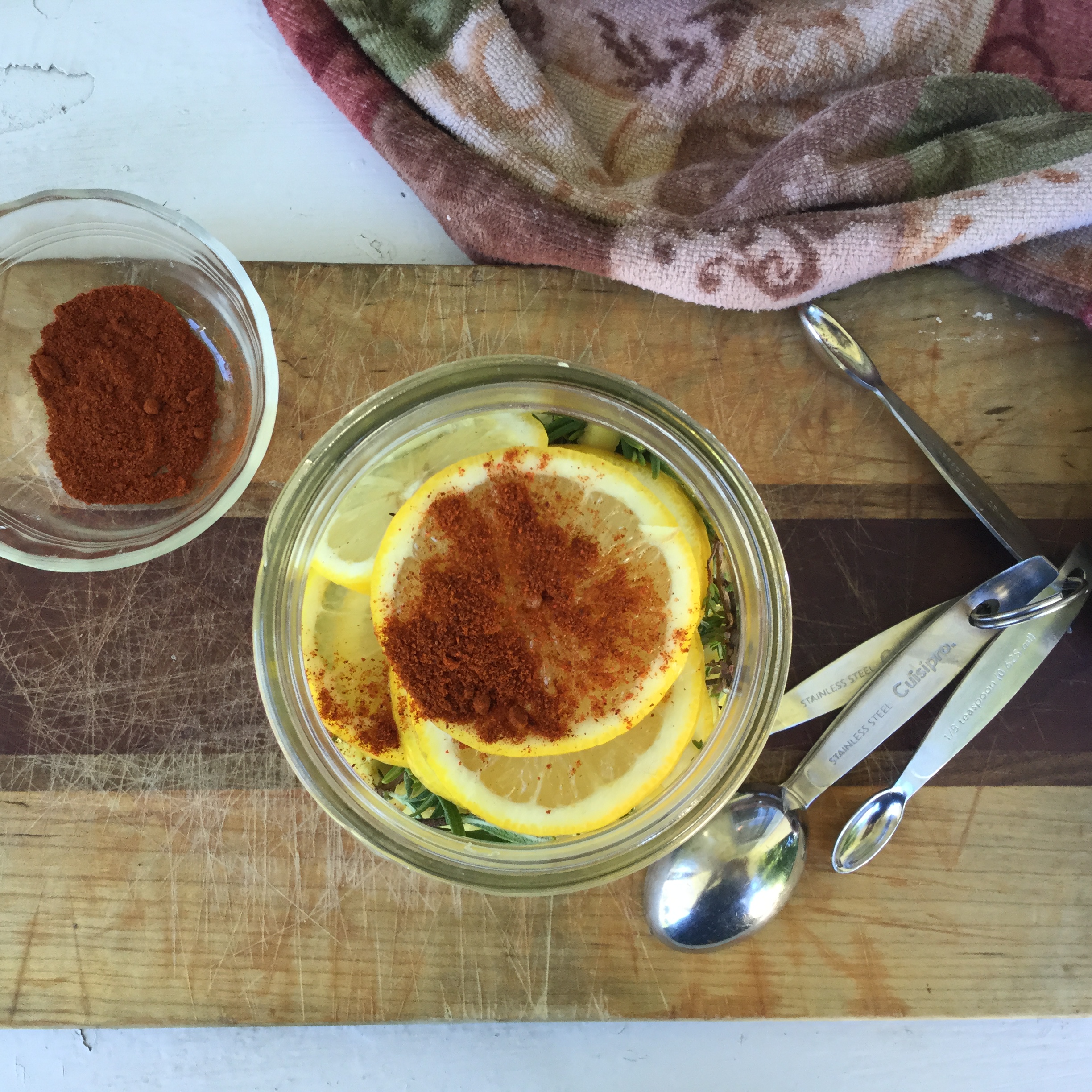 - Add herbs (if using), lemon, cayenne pepper and turmeric to the jar. Fill to the rim with apple cider vinegar and seal with a tight fitting lid.
