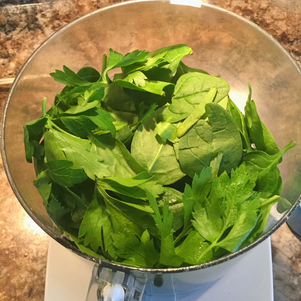 1. In a food processor, process the basil, parsley, garlic, nuts, nutritional yeast, lemon juice and sea salt until coarsely chopped. Add olive oil and pulse until smooth.