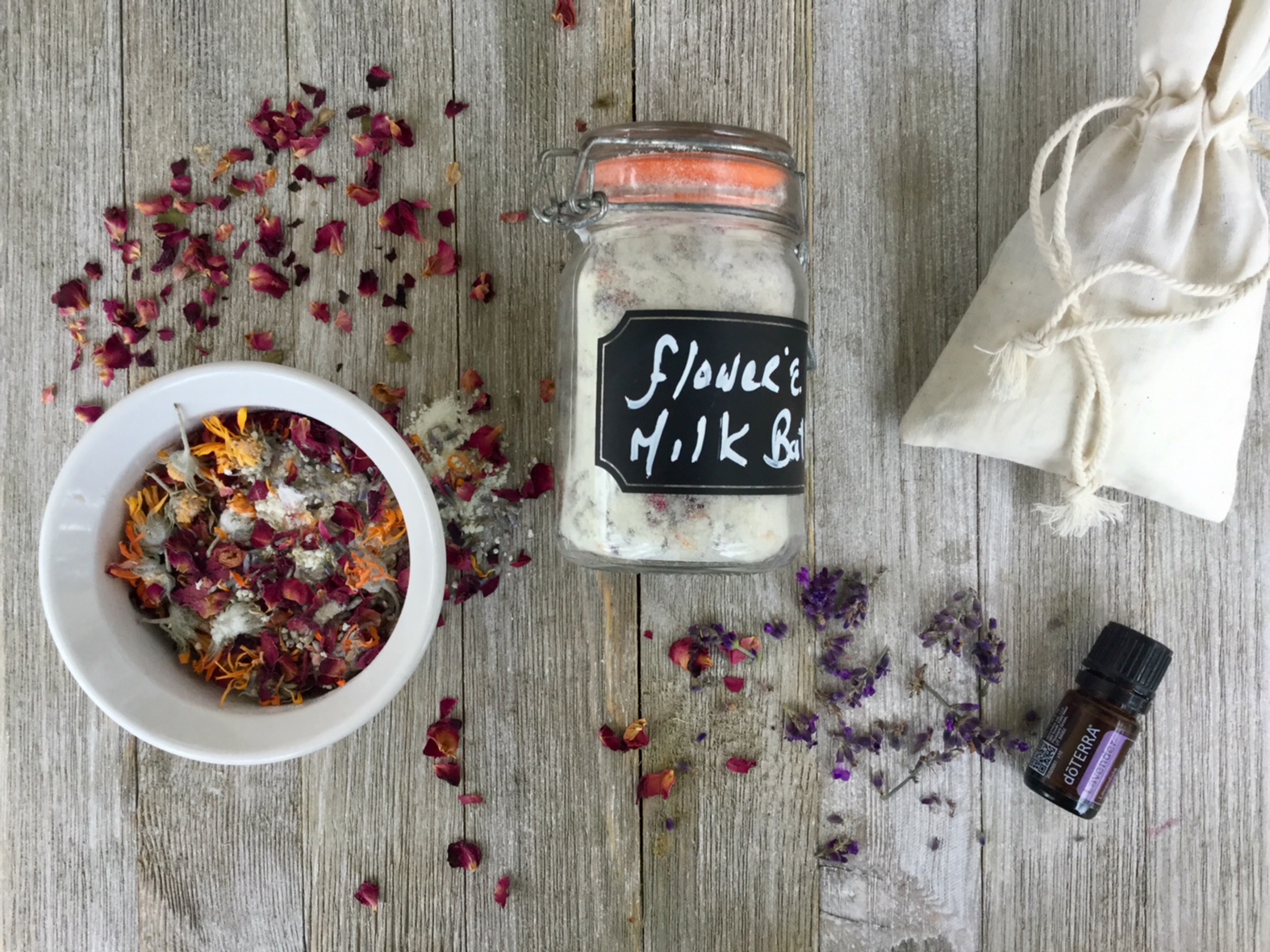 Another option for gift giving would be to layer your flowers in the jar. Instead of combining all the ingredients together, simply combine the powdered milk, baking soda and essential oils and then create layers with your flowers and the powdered mixture.