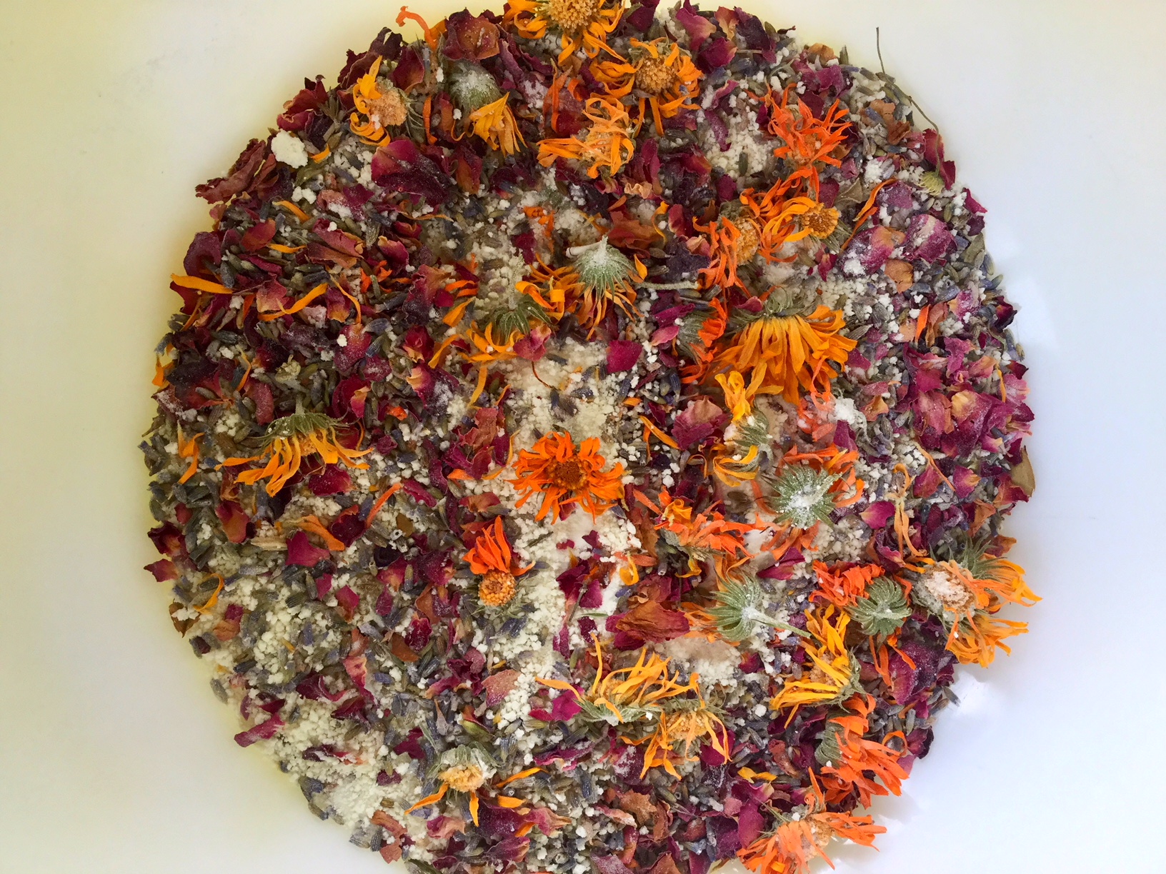 To use, pour 1/2 to 1 cup of the bath tea into a hot bath. Stir with your hands to dissolve. Place a strainer in the tub’s drain before draining to catch any dried flowers or hang a muslin bag filled with the bath tea from your tub’s faucet as you are filling the tub. Do not ingest.